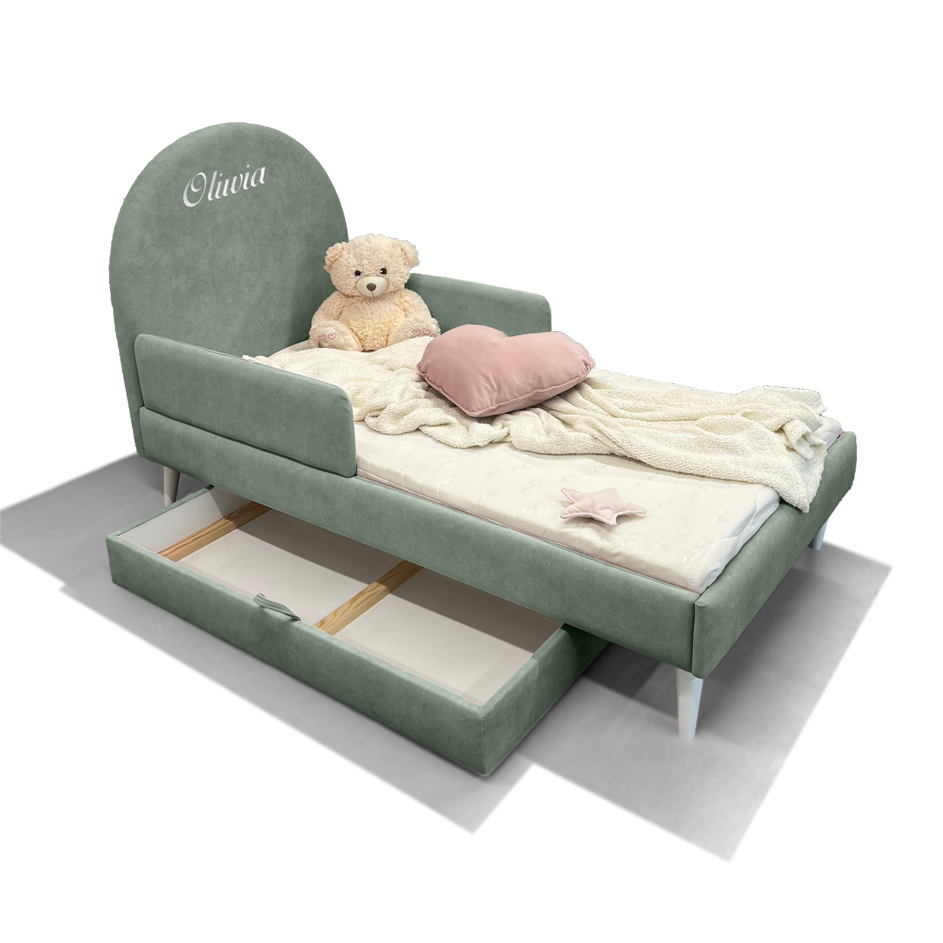 ✅ Możliwość dołączenia szuflady – dodatkowe miejsce na pościel, zabawki lub inne akcesoria (na kółkach),