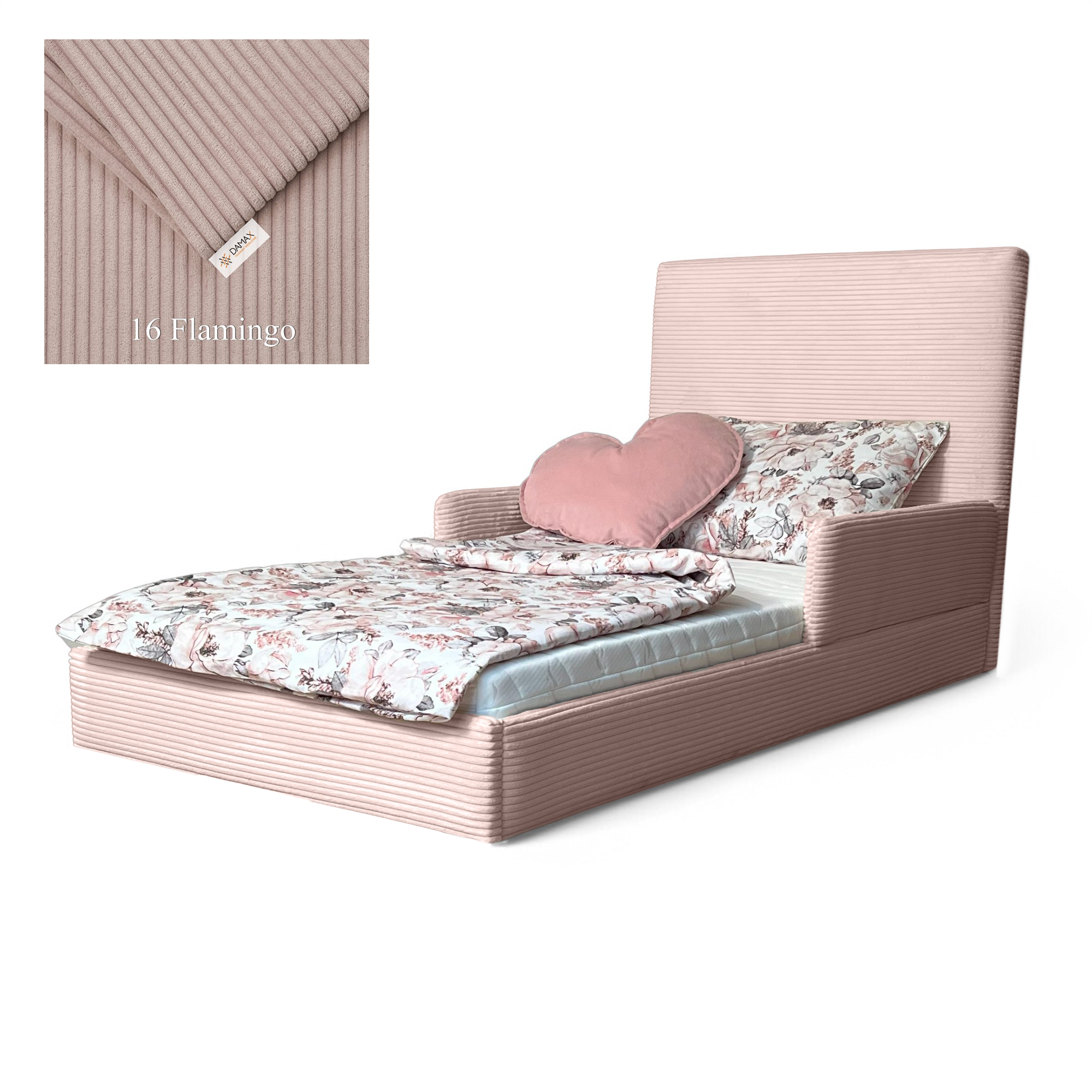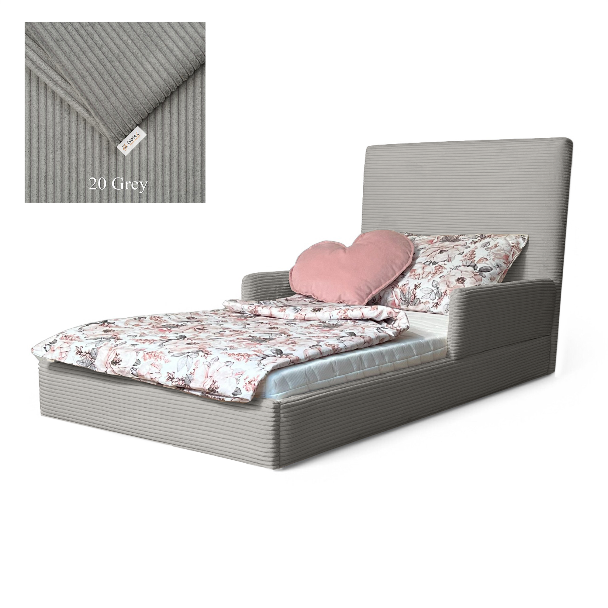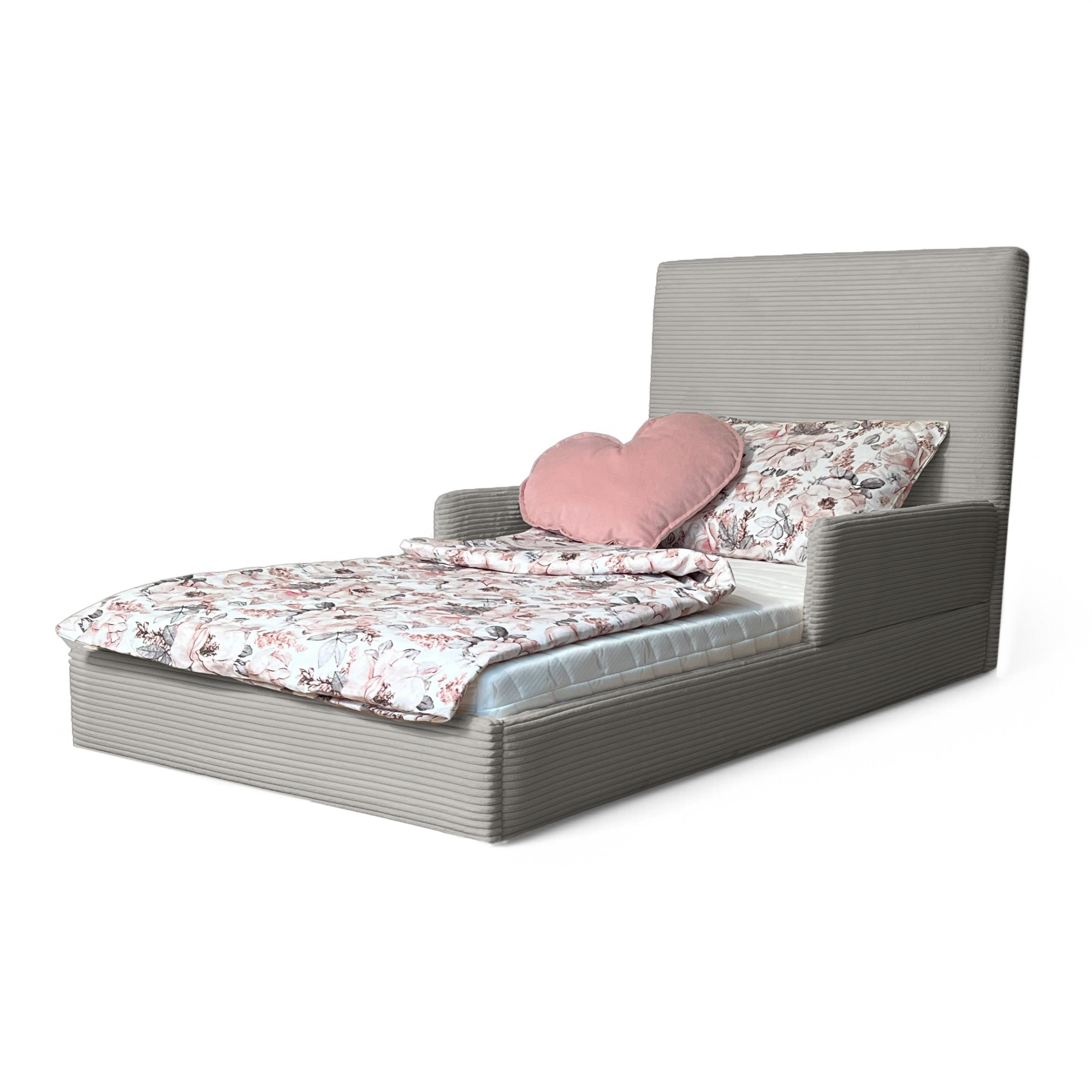 Model „Fabio” wyróżnia się nowoczesnym designem i tapicerką wykonaną z modnej tkaniny sztruksowej, która nadaje mu wyjątkowy wygląd i przytulny charakter. Uniwersalny design sprawia, że łóżko doskonale pasuje zarówno do pokoju chłopca, jak i dziewczynki. Solidna konstrukcja i zaokrąglone krawędzie gwarantują stabilność oraz bezpieczeństwo podczas snu i zabawy.