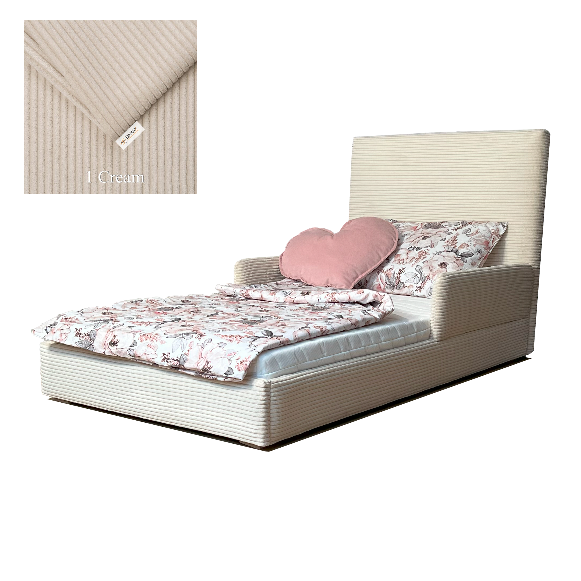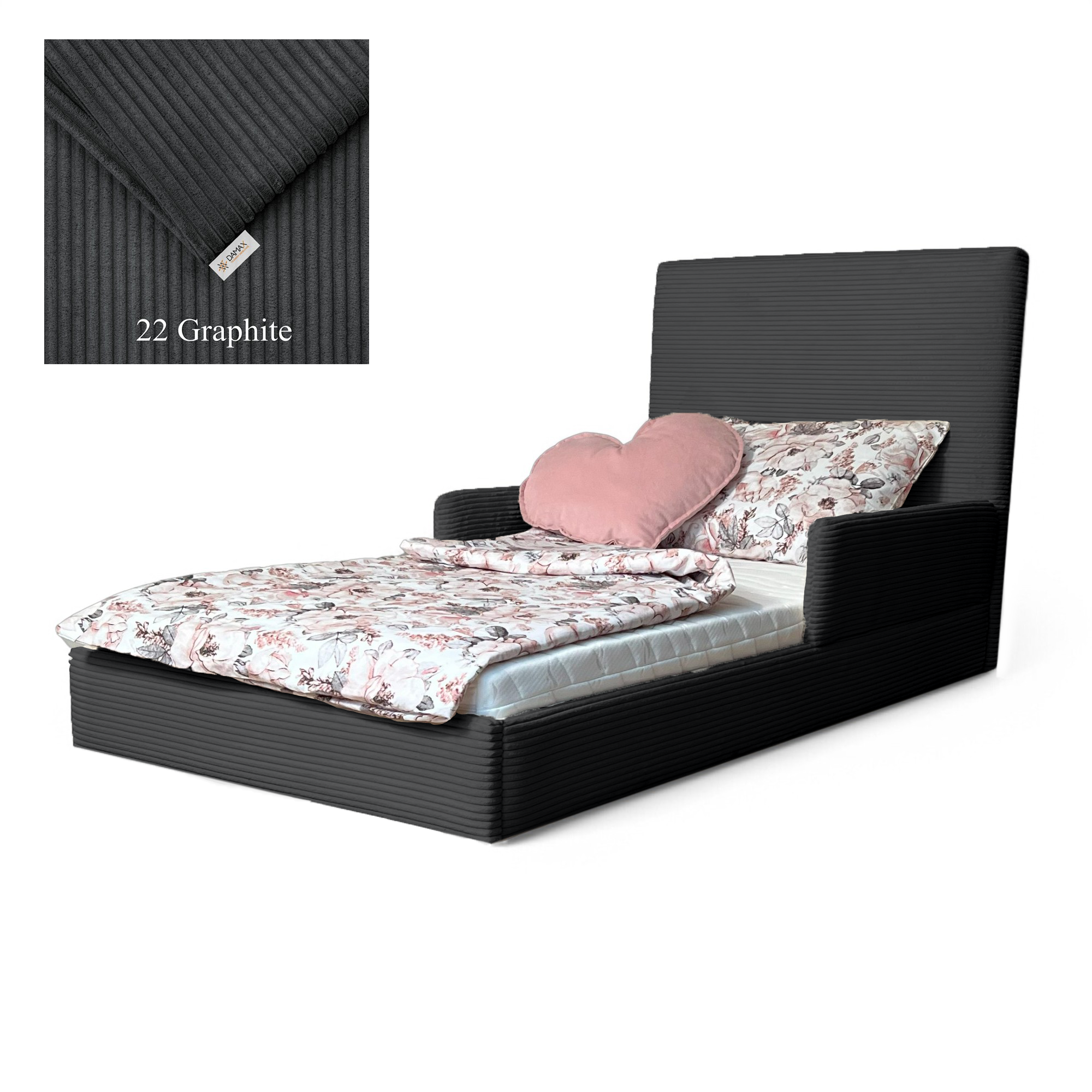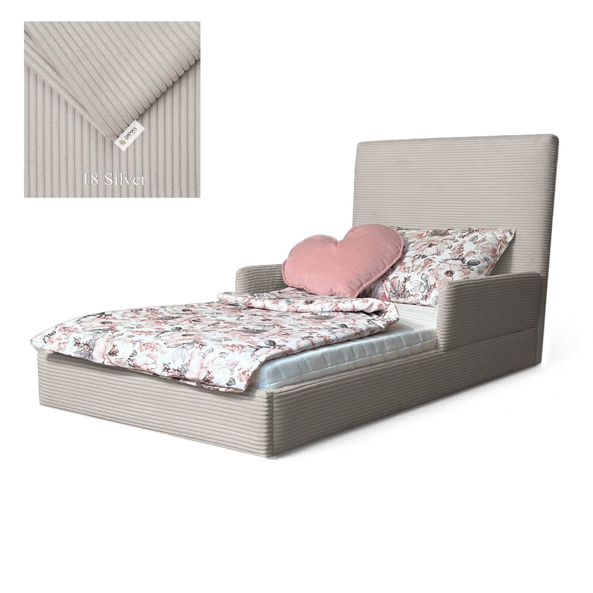 Model „Fabio” wyróżnia się nowoczesnym designem i tapicerką wykonaną z modnej tkaniny sztruksowej, która nadaje mu wyjątkowy wygląd i przytulny charakter. Uniwersalny design sprawia, że łóżko doskonale pasuje zarówno do pokoju chłopca, jak i dziewczynki. Solidna konstrukcja i zaokrąglone krawędzie gwarantują stabilność oraz bezpieczeństwo podczas snu i zabawy.