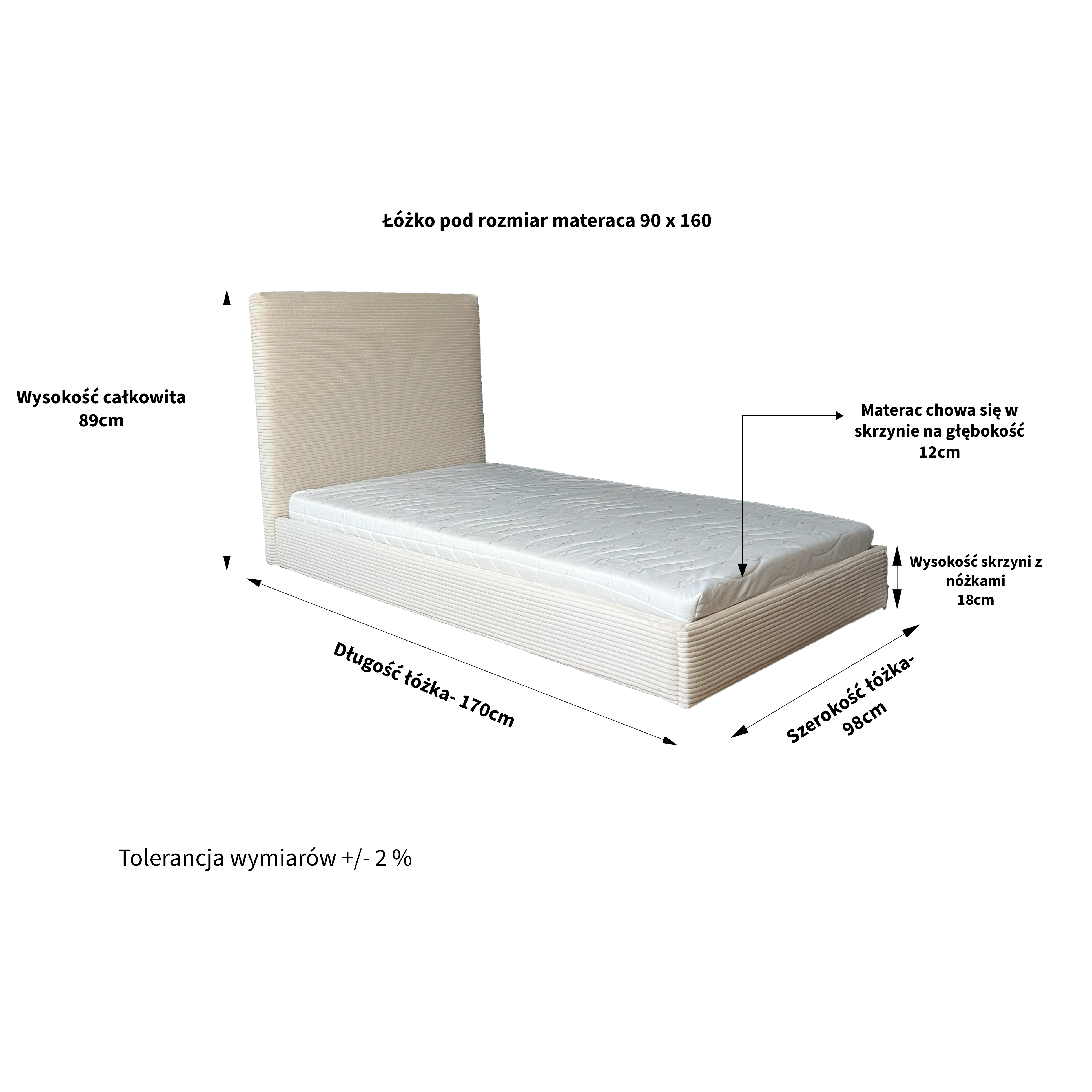 - DŁUGOŚĆ CAŁKOWITA – 170cm (przy długości materaca 160cm)