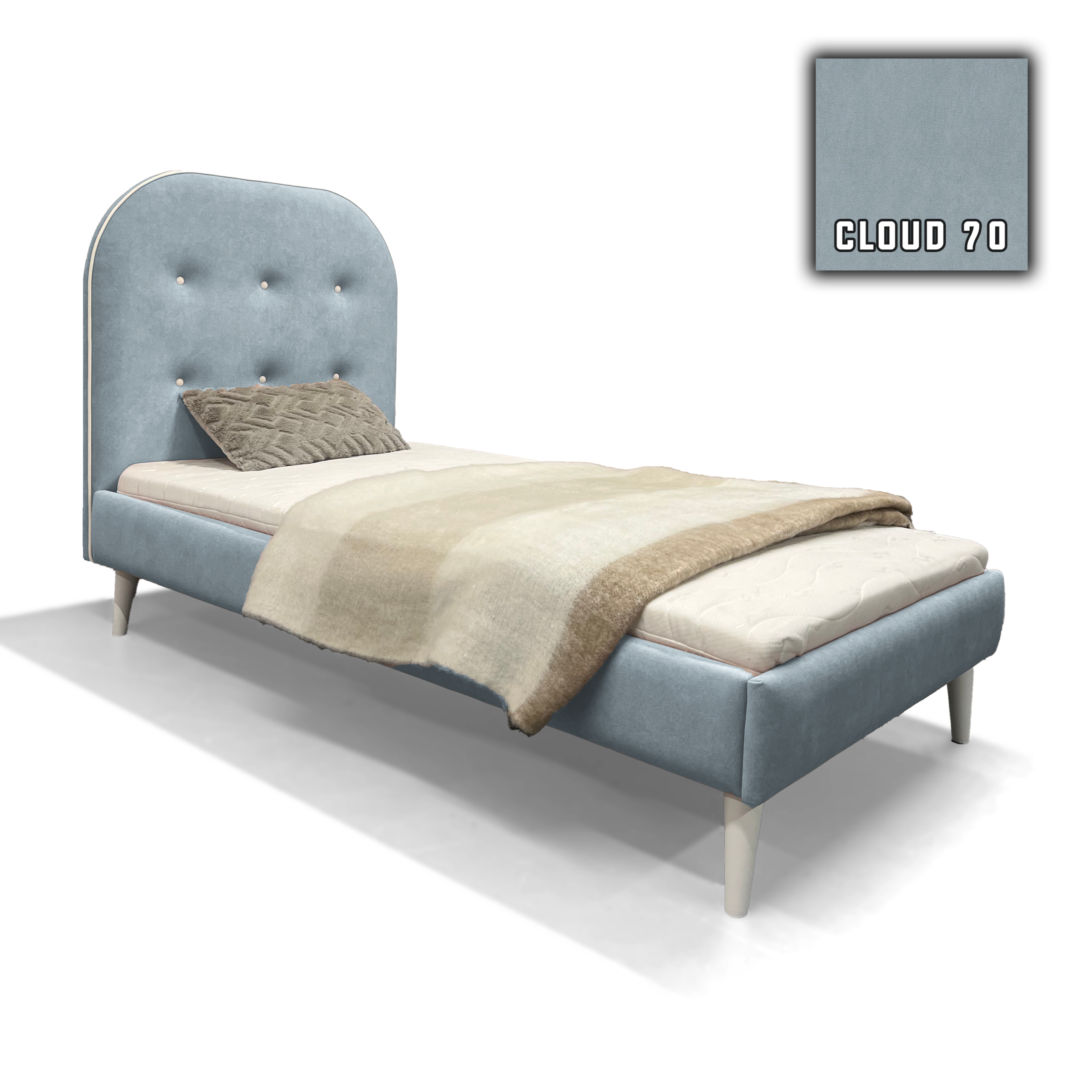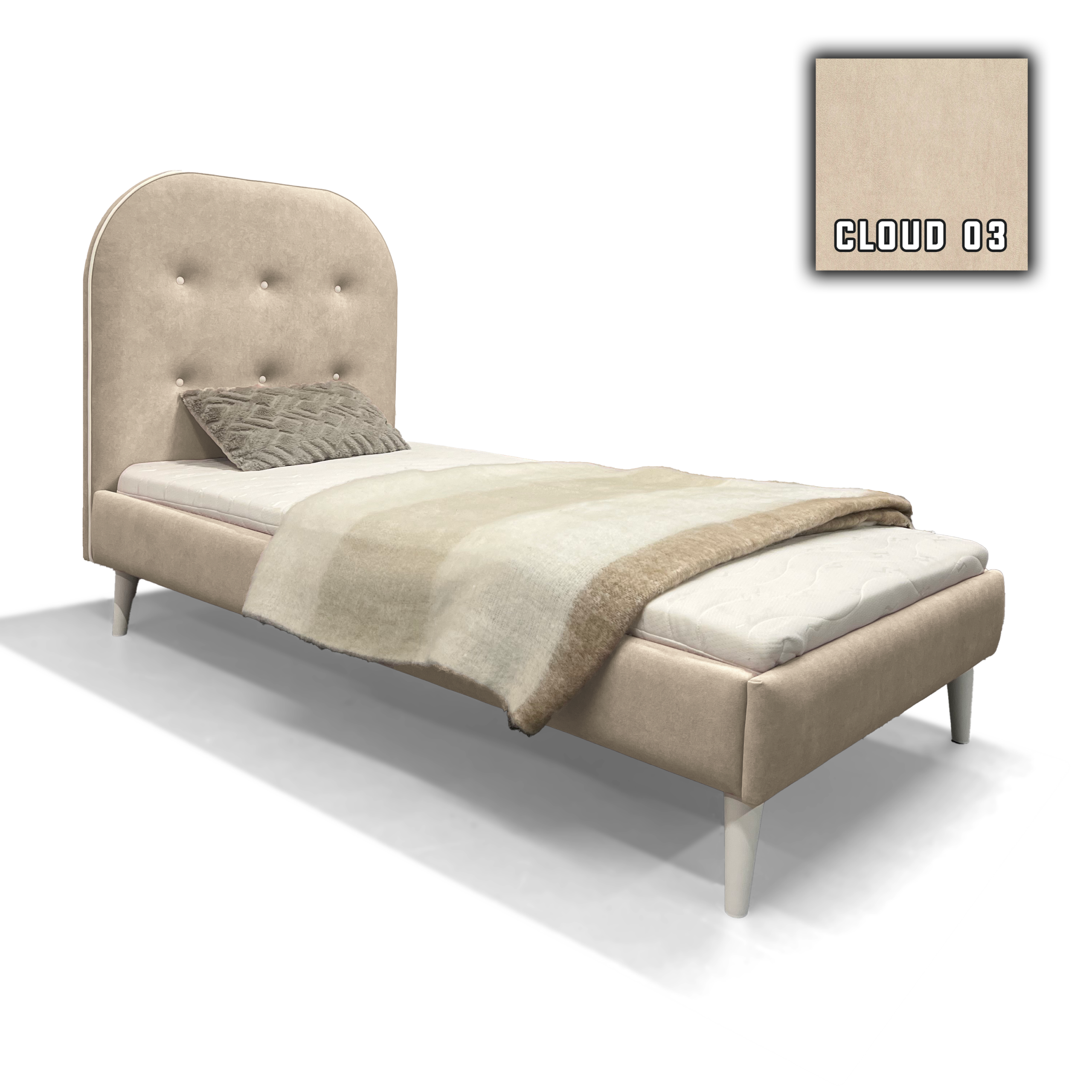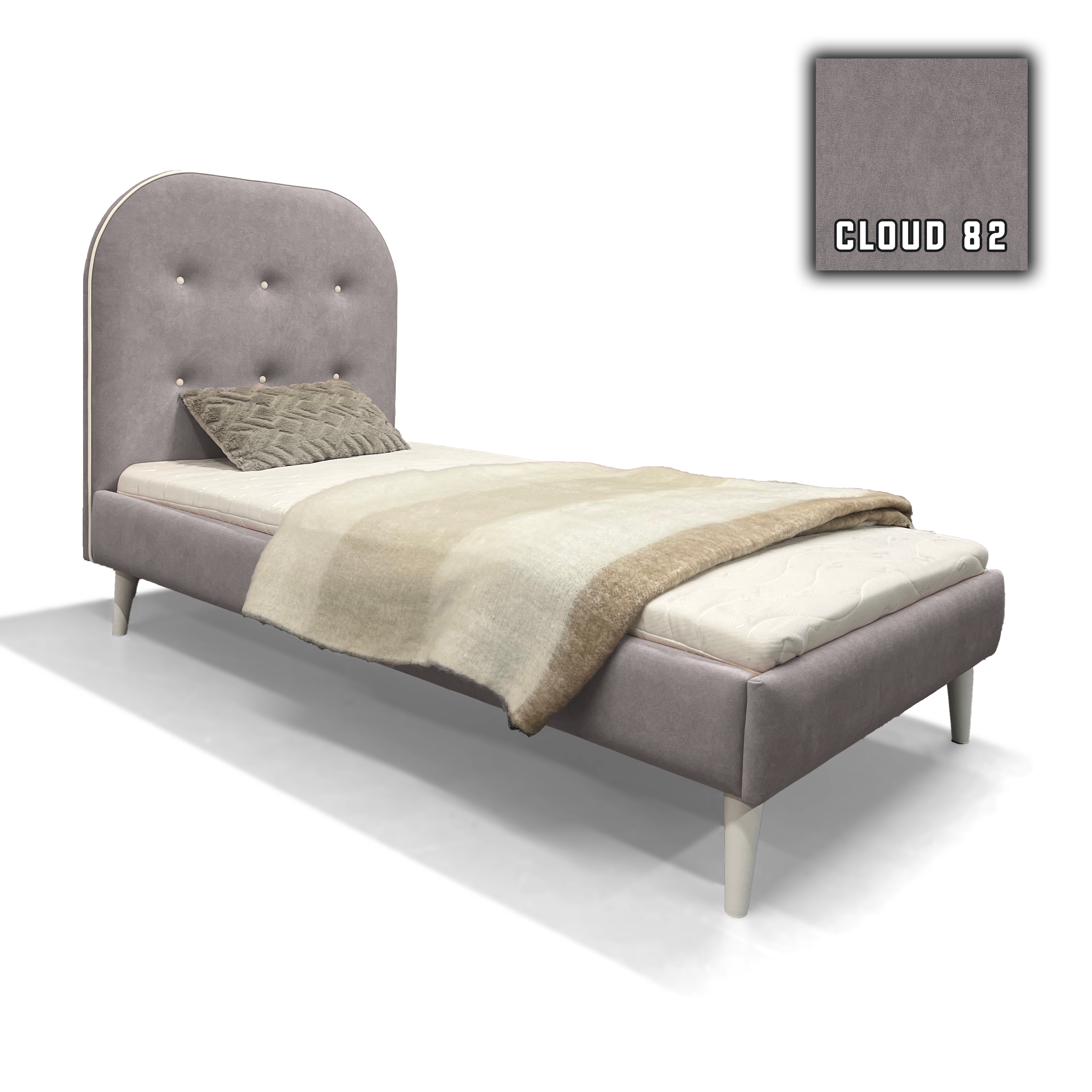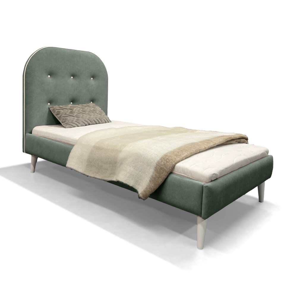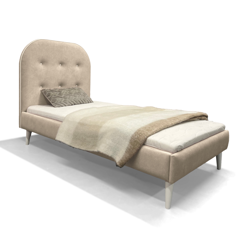 Model „FIGO” wyróżnia się wysokimi nóżkami, które ułatwiają sprzątanie i nadają nowoczesnego charakteru. Miękko tapicerowany, zagłówek z ozdobnymi guzikami i białą lamówką zapewnia komfort podczas czytania i odpoczynku.