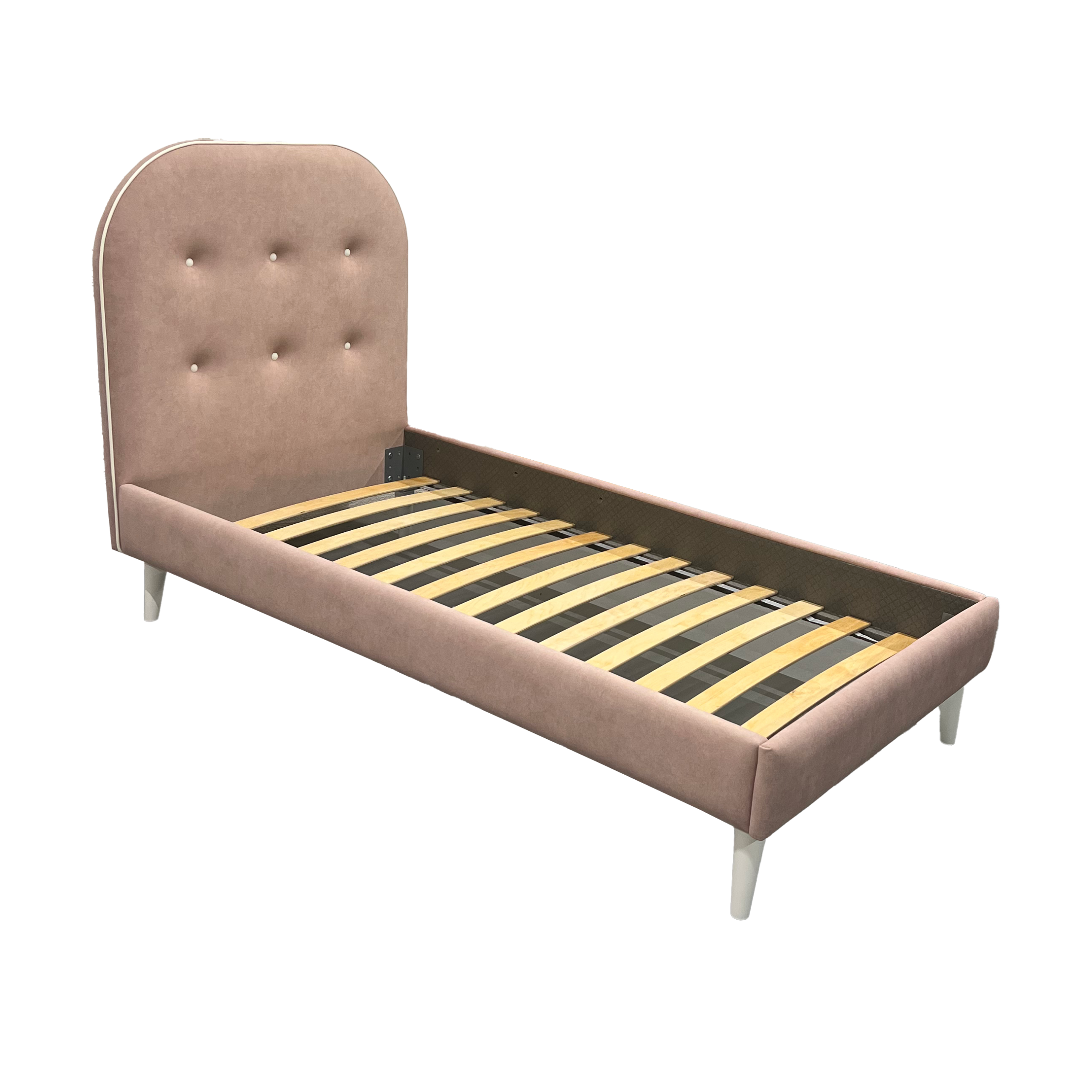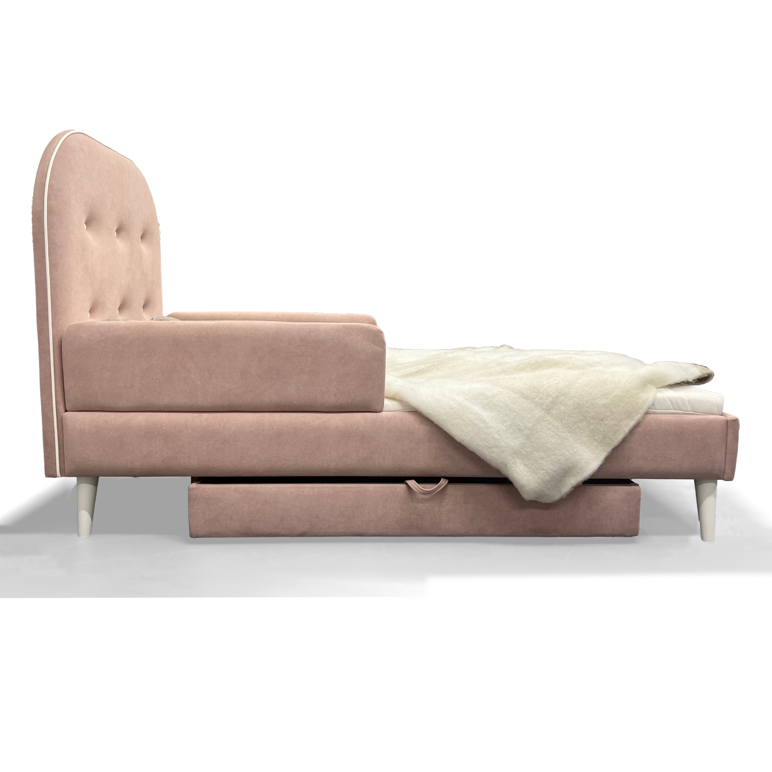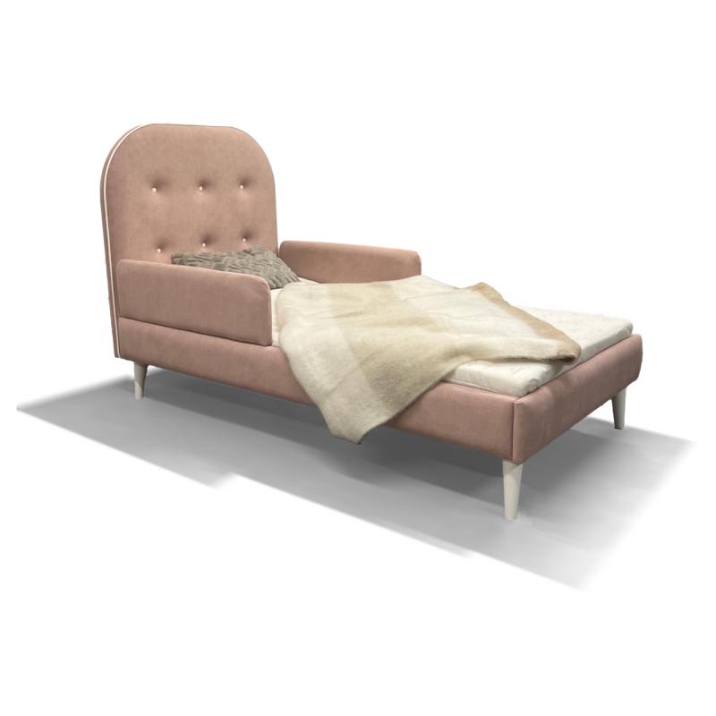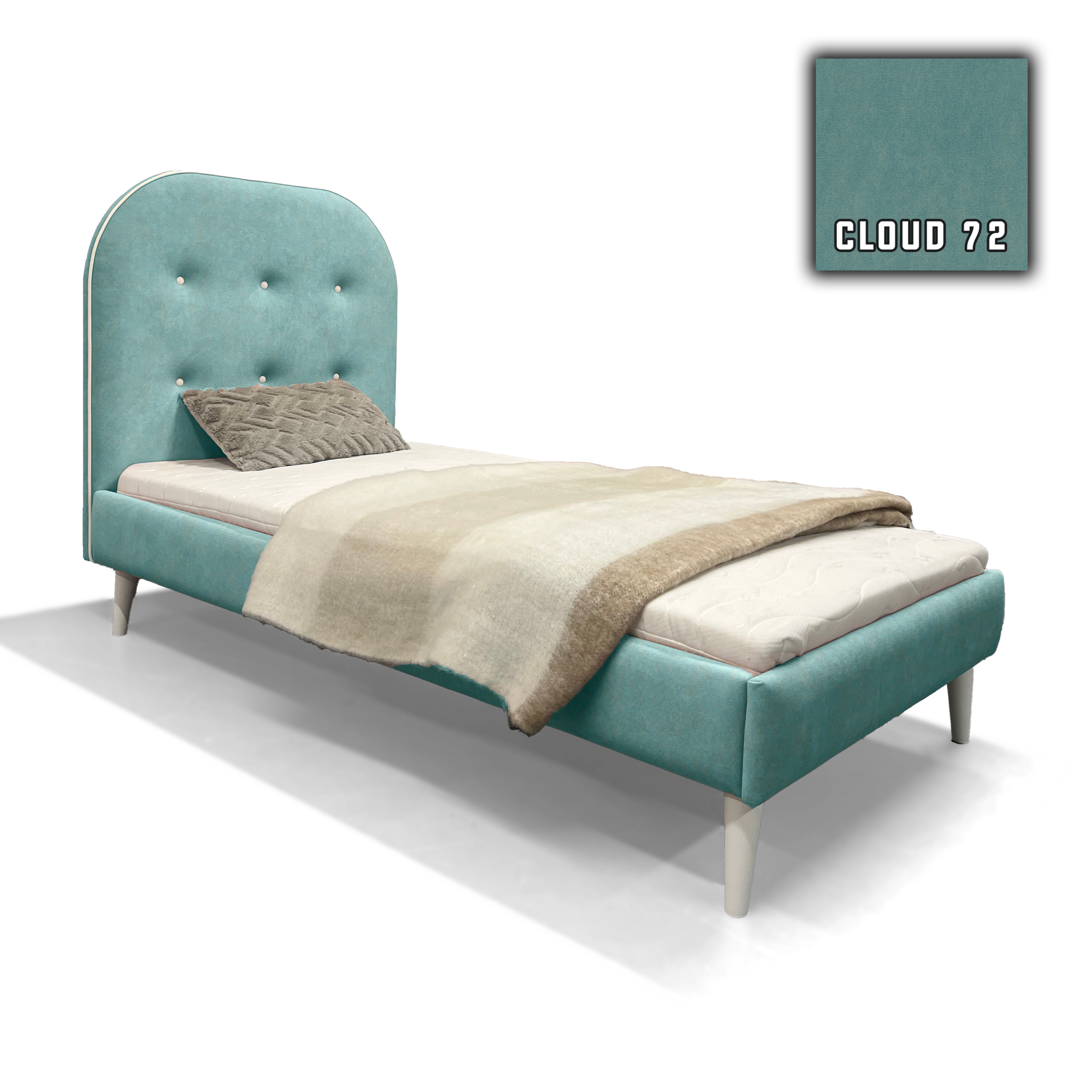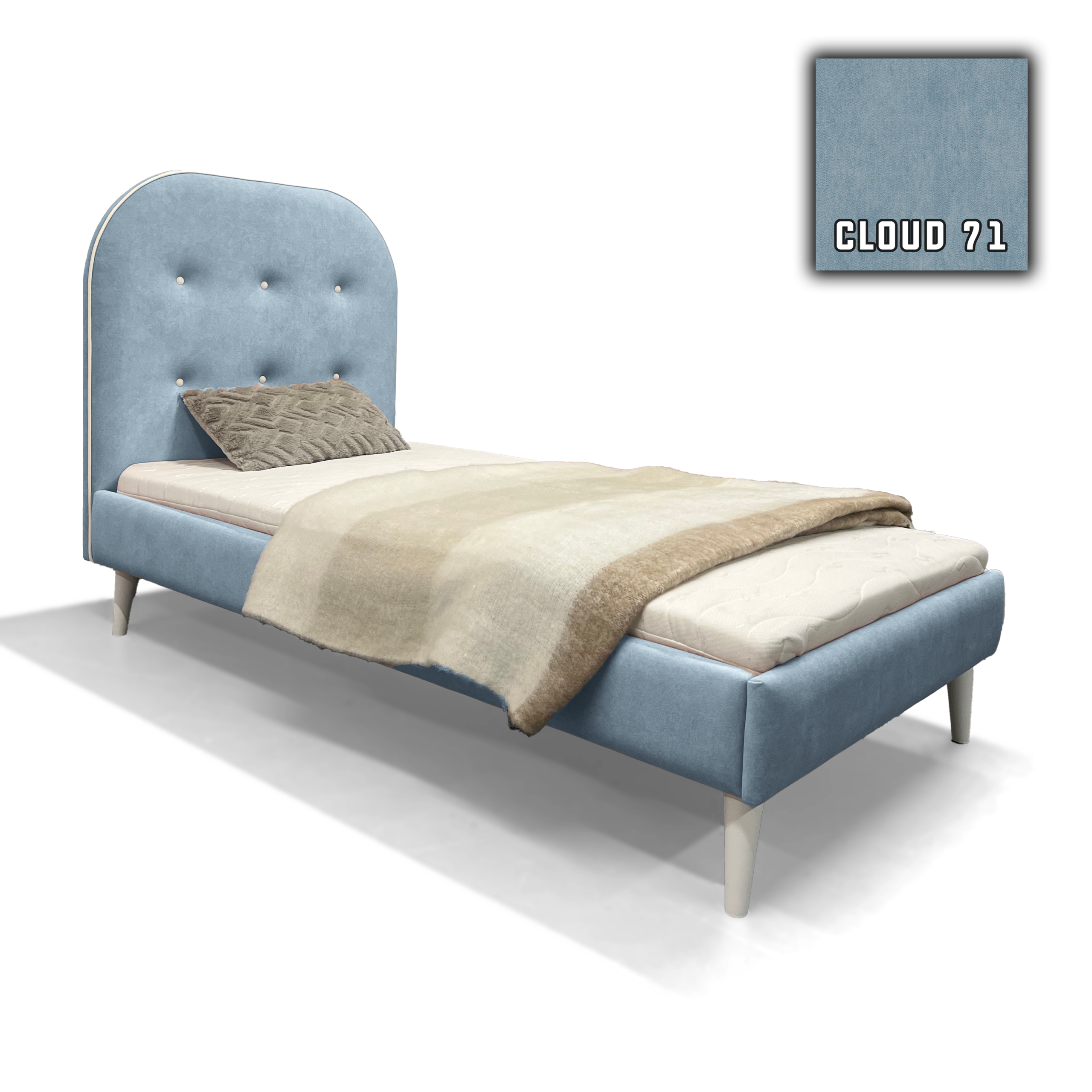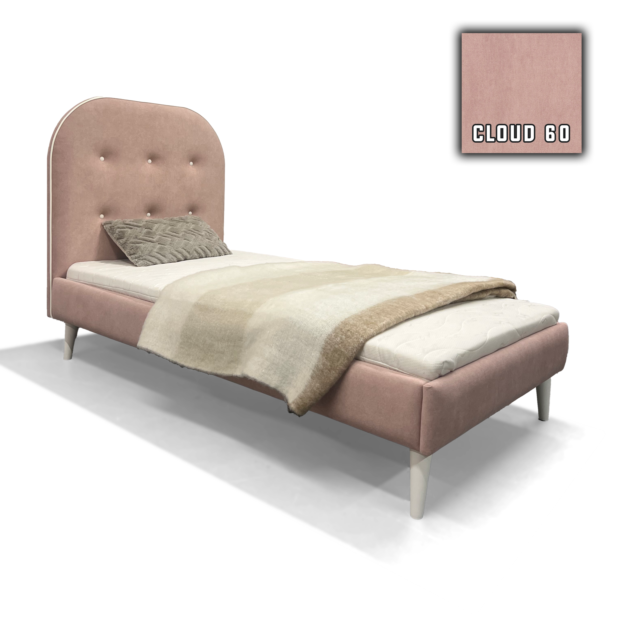 Model „FIGO” wyróżnia się wysokimi nóżkami, które ułatwiają sprzątanie i nadają nowoczesnego charakteru. Miękko tapicerowany, zagłówek z ozdobnymi guzikami i białą lamówką zapewnia komfort podczas czytania i odpoczynku.